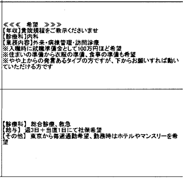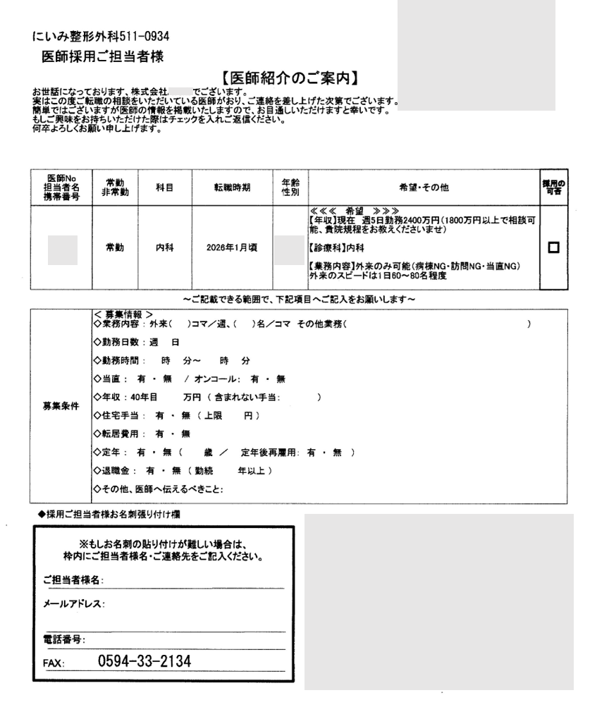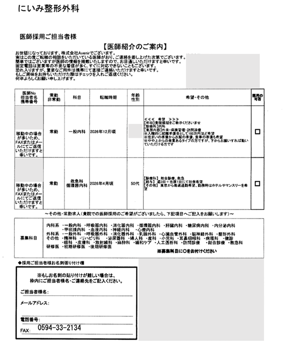 当院では医師を募集しています。それをホームページか他の求人媒体で知ってFAXを頂いたのだと思います。