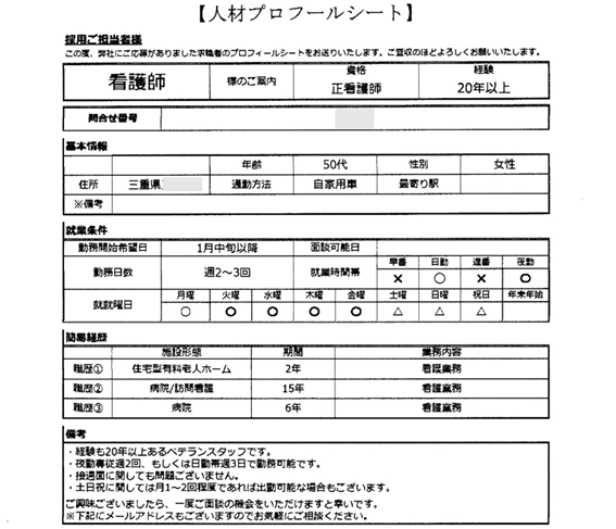次に、別の会社さんです。看護師紹介です。見やすいシートです。 ≪ ケース③ ≫