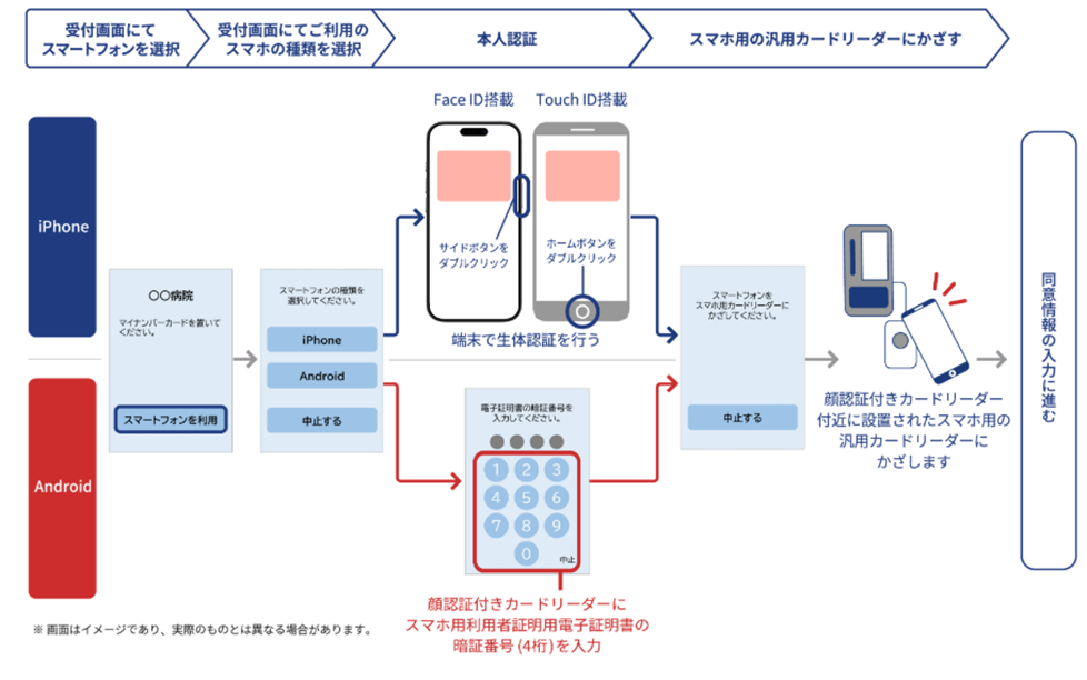 これまでマイナンバーカードを保険証として利用する場合は、カードそのものを受付の端末にかざしていただいていましたが、今後はマイナポータルアプリを利用したスマートフォンでも、保険証確認が可能となります。